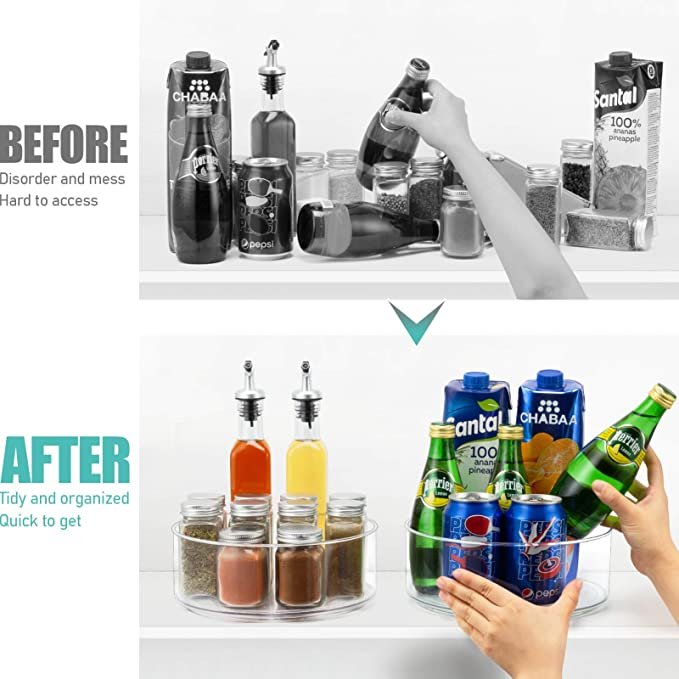 Tiblue smart storage lazy susan is designed to make items contained quick and easy to access. Large capacity to fit spices, cans, baking supplies, snacks, makeups, jars. This revolving container maximizes storage space for pantry, cabinets, countertops, bathroom cabinet, refrigerator, office, laundry, garage, on shelves or under the sink.