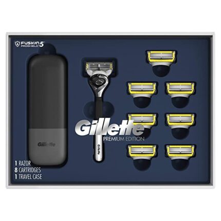Gillette Premium edition Fusion5 ProShield. The ultimate grooming gift for the man in your life who values both form and function. Inside, you'll find a premium edition ProShield razor handle, 8 ProShield blade refills, and a convenient travel case. The premium edition ProShield razor handle fits all Fusion5 blade refills.