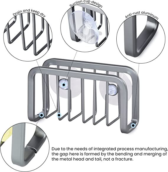 - Suction Cup Sponge Holder – The kitchen sink caddy is made of aluminum, the aluminum structure is light and will not rust. The kitchen sink sponge holder is designed to drain quickly, keeping the sink ventilated, dry and clean.