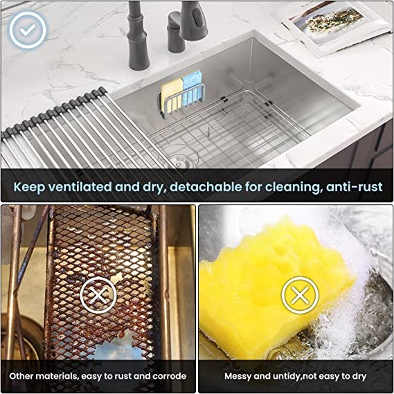 - Open Design – Both ends of the kitchen sink caddy are open for easier removal, ideal for storing sponges, brushes or drain plugs and more, the kitchen sponge holder is an ideal sink accessory for kitchens, bathrooms, restaurants and more.