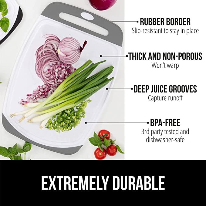 - Reversible Design with Deep Juice Grooves: each Gorilla Grip Cutting Board features a reversible design that allows you to chop on both sides to help prevent flavor mingling; boards also feature deep juice grooves on one side to help prevent countertop mess by catching runoff juices