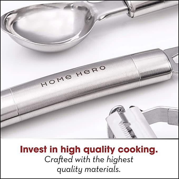- Suited to any kitchen, HomeHero is the best kitchen utensils set you could ask for. Crafted with 100% stainless steel & silicone non – stick materials, these timeless stainless steel utensil set are beautiful housewarming gifts. With measuring cups & measuring spoons, skimmer, slotted spatula, garlic press, cheese knife, tea strainer, wine opener, potato peeler & more, you have everything you need to cook masterful meals. Scroll to see complete list of cooking tools.