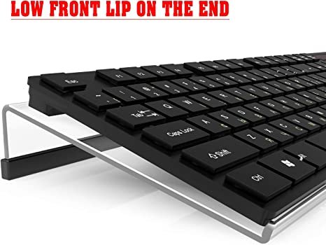 - Low Front Lip on the End – keyboard riser for desktop holds slimline keyboard, prevents it from falling off the PC keyboard stand when typing.