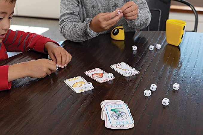 - 33-piece set includes high quality Bee shaker cup / storage container, 16 letter dice, 15 double-sided colorful, laminated cards for long time use in classrooms and at home, and instruction card