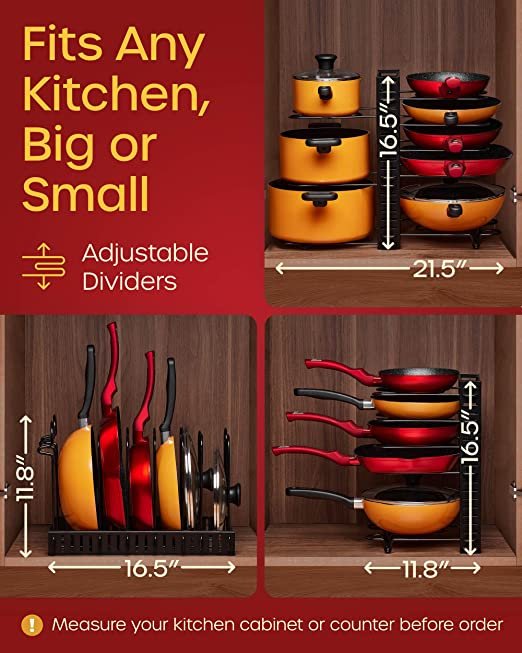 - 【Adjustable Design】 The dividers of our pot pan organizer are designed to be adjustable so you can adjust the position of each divider; giving you the ability to store different size pots and pans; The sizes and direction of this pan organizer rack can be adjusted according to your needs; giving you more flexibility in organizing your pots and pans