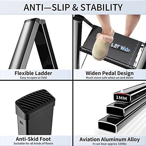- 【SECURITY AND STABILITY】: The sturdy ladder is made of thickened aviation-grade stainless aluminum alloy. The surface has been treated to make it wear-resistant and rust-proof. High grade frame and structure make your use secure and stable.The side cross brace structure strengthens the basic support, making you feel safer when using the step ladder(even on the top pedal). Maximum Load: 330 lbs.